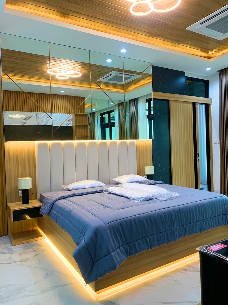 Kami menata pencahayaan kamar agar nyaman dan estetik. Lampu utama, lampu samping, LED strip, dan spotlight dipasang sesuai konsep desain.