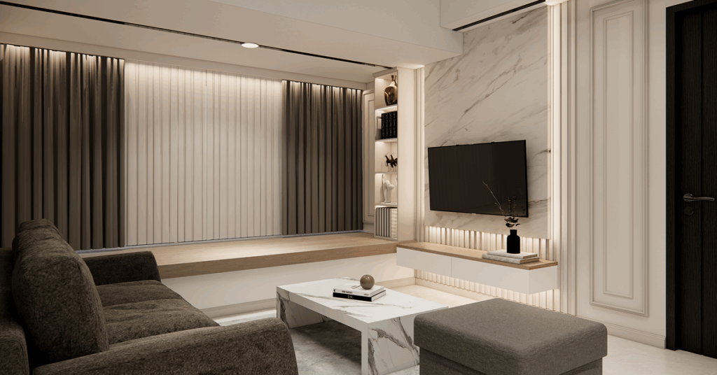 Kami merancang ruang tamu secara menyeluruh, mulai dari menentukan tone warna yang paling pas, mencarikan furnitur yang proporsional, membuat backdrop TV custom, mendesain rak pajangan, hingga dekorasi pelengkap yang membuat ruangan tampak lebih hidup.