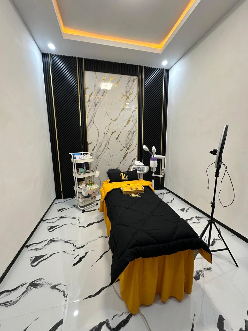 Custom backdrop dengan lighting LED dan rak terintegrasi.