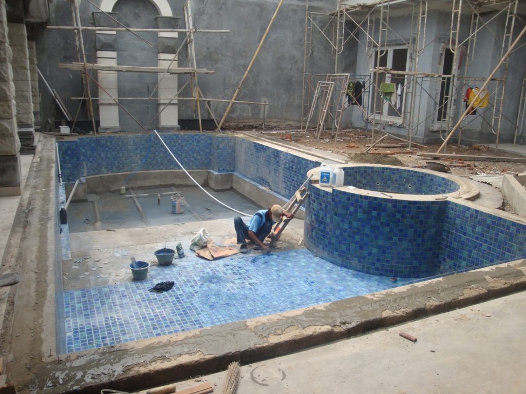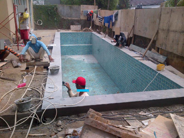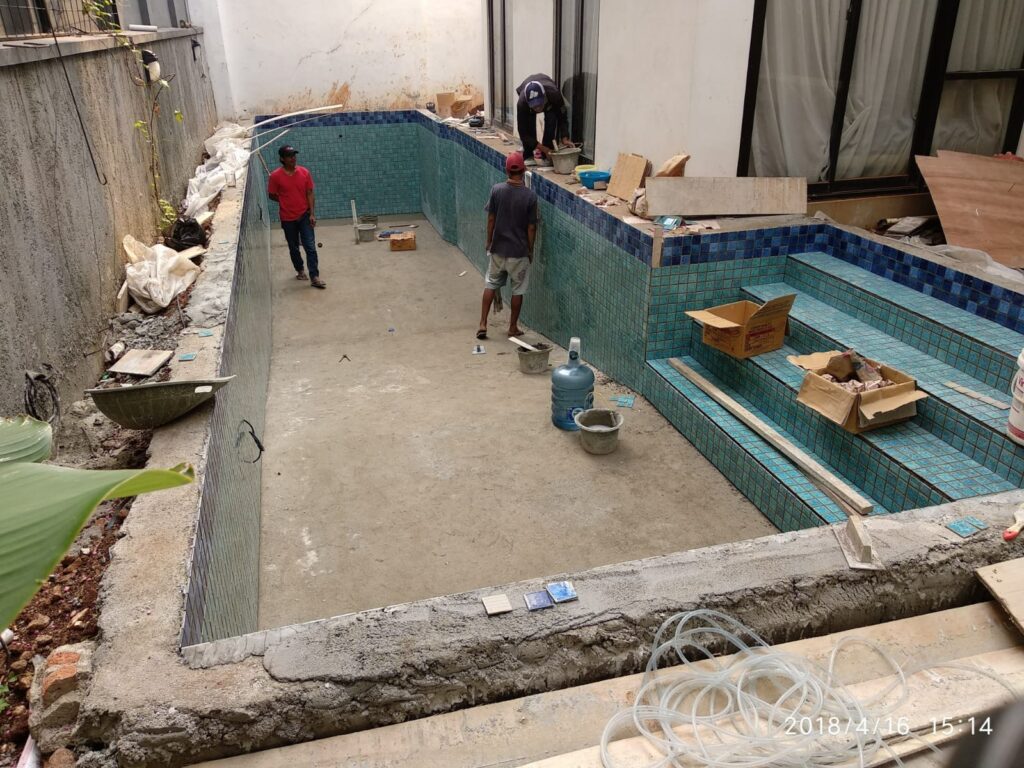 Pengecatan, tile, lampu, landscape, pengecekan kualitas, kemudian kolam siap digunakan.